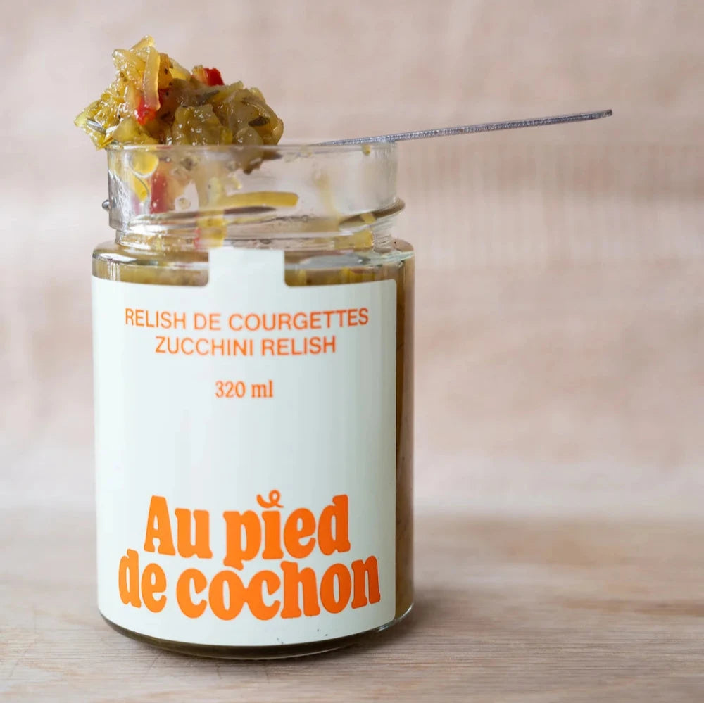 Courgettes, sucre blanc, vinaigre blanc, oignons, poivrons, gros sel, poivre, graines de céleri, curcuma, fécule de maïs.