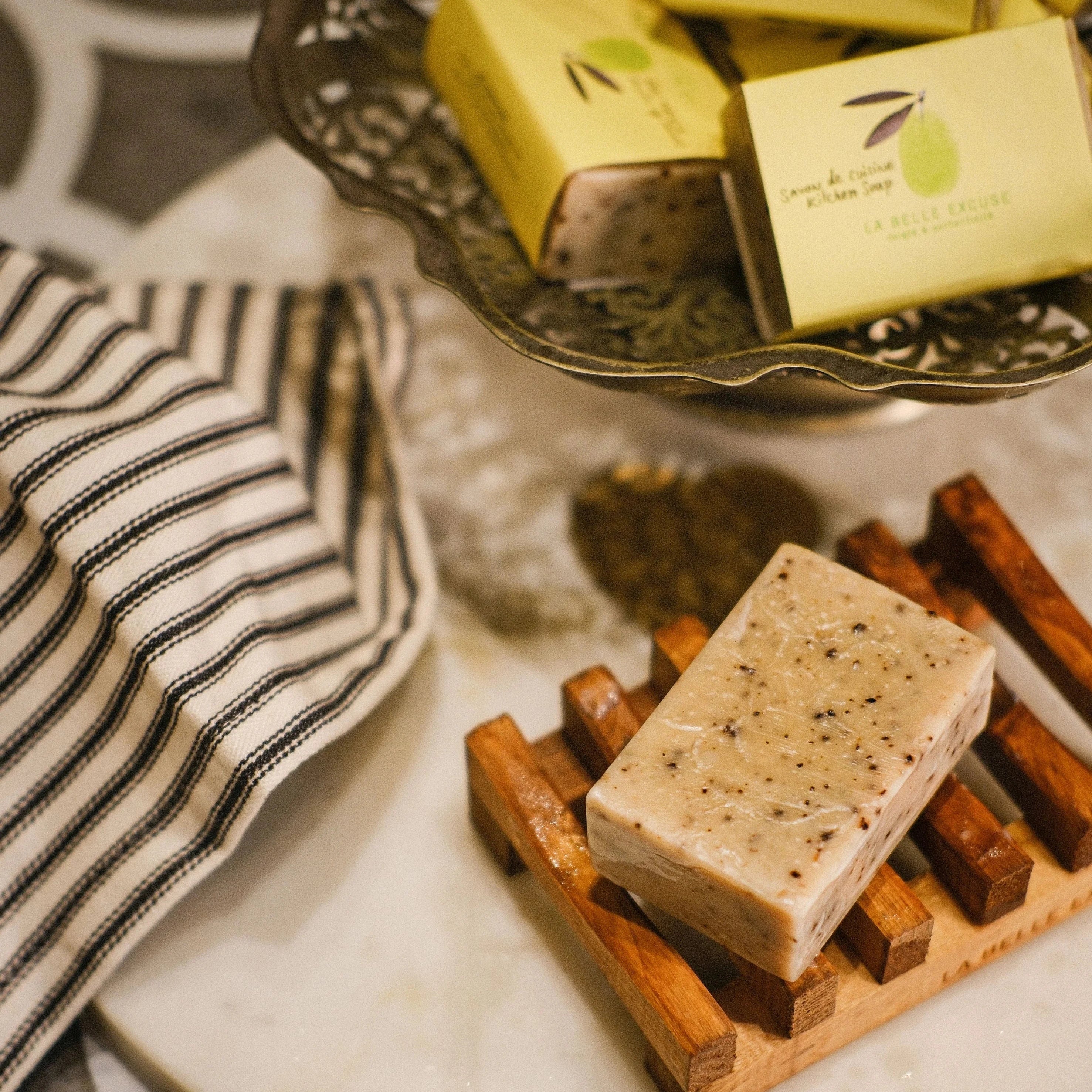 Ce savon de cuisine contient 70% d'huile d'olive La Belle Excuse. Il est très efficace dans la cuisine pour enlever de vos mains toutes les odeurs d'ail, d'oignon et de poisson.