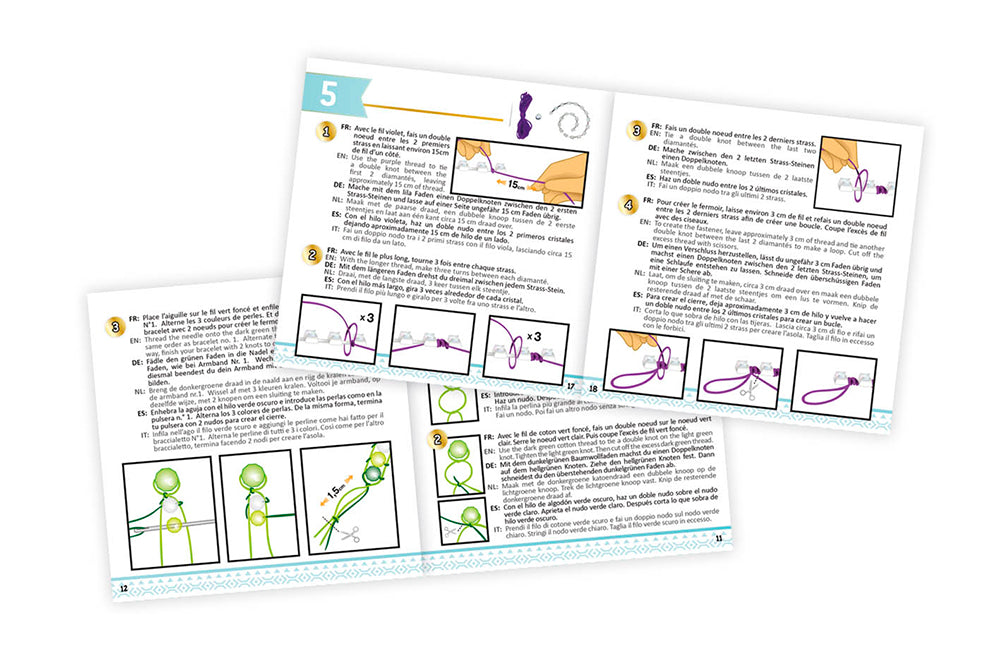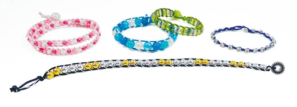 Entoure les perles avec de la corde cirée et des fils de coton pour réaliser de superbes bracelets! Notice illustrée en couleurs.