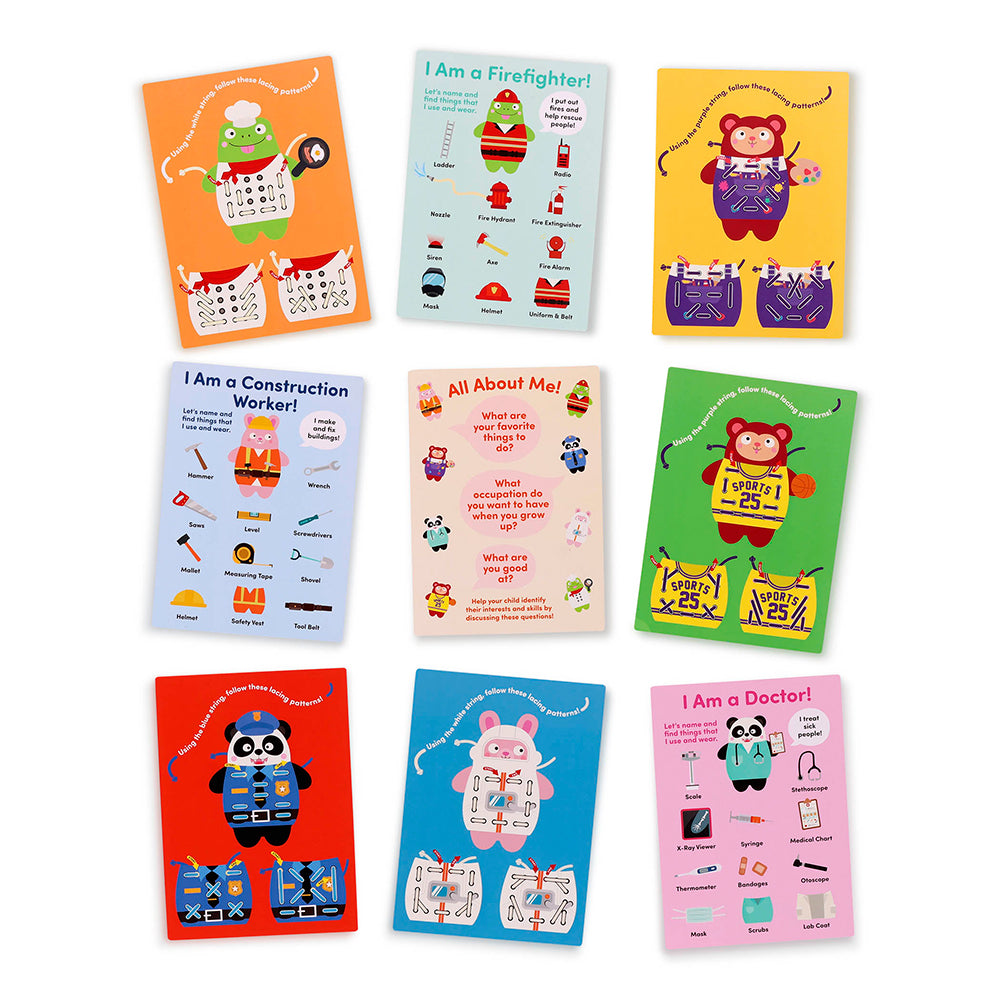 Explorez différents métiers, développez vos compétences motrices fines et amusez-vous à vous déguiser avec cet ensemble de jeu en bois pour lacets mettant en scène des animaux! Composé d'amis tels que l'ours, la grenouille, le panda et le lapin à habiller. Un livret de guide de jeu est inclus pour enrichir l'expérience.
